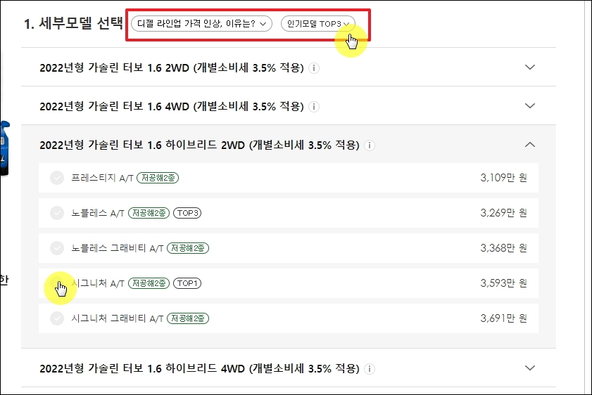 ▼세부모델을 정하지 않은 분이라면 인기모델 TOP3에서 하나를 정하면 됩니다. 임시적으로 스포티지 가격표를 확인하기 위한 것이기 때문에 아무거나 선택해도 약간의 차이는 있지만, 최종 구매 비용을 구할 수 있습니다.