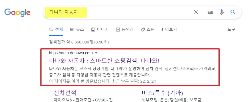 ▼다나와 자동차 홈페이지에 접속했습니다. 사이트에서 메뉴에 있는 [신차검색]을 클릭합니다. 신차 가격표 외에도 중고차, 렌트, 리스에 대한 스포티지 가격표 열람도 가능합니다.