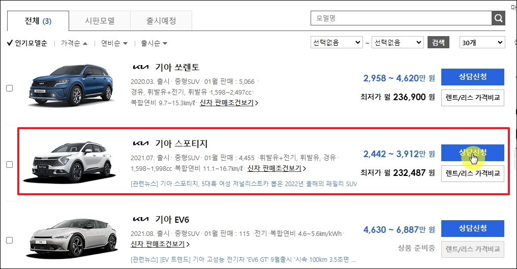 ▼검색 결과가 나왔습니다. 기아자동차에서 만드는 중형SUV는 스포티지 외에도 쏘렌토와 EV6가 있음을 알 수 있습니다. 간단한 가격표가 나오지만, 우리가 찾는 것은 아닙니다. 저렇게 가격대가 범위로 나와 있는 것은 파악하기가 쉽지 않죠. [상담신청] 버튼을 누르면 가격표 이용이 가능합니다. 상담은 가격표 확인 이후에 하고 싶으면 하는 것이기 때문에 신경 쓰지 않으셔도 됩니다.