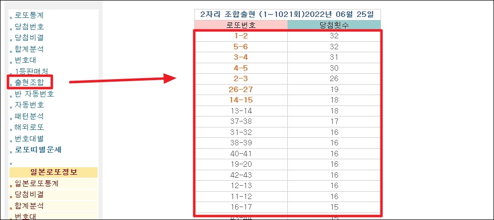 ▼이번에는 로또 당첨 결과에서 출현한 2자리 조합을 분석한 결과입니다. 가장 많이 나온 조합으로는 1번과 2번 숫자 그리고 5번과 6번 숫자로 32회나 출현이 되었습니다.