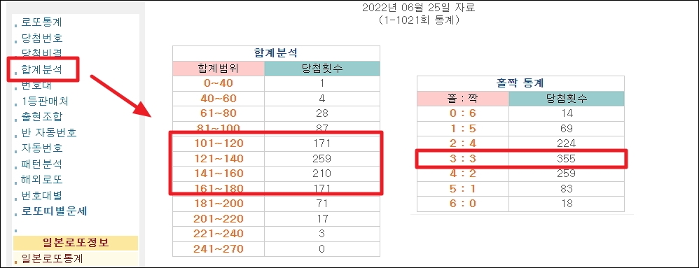 ▼로또 게시판이 열렸습니다. 지금까지 당첨된 번호를 가지고 만들어진 통계 자료를 만나볼 수 있는 곳인데요. 여기에 더하여 통계자료를 활용한 생성기 프로그램도 이용할 수 있습니다. 좌측에 있는 메뉴에서 [합계 분석]을 클릭해 보세요. 그럼 로또 당첨에 나온 수자를 모두 합한 값을 가지고 분석한 자료를 확인할 수 있습니다. 숫자를 모두 합한 값이 121에서 140 사이인 경우가 259회나 당첨이 되었을 정도로 가장 많이 나왔네요. 홀짝의 경우에는 홀수 3번, 짝수 3번 이렇게 반반인 경우가 가장 많습니다.