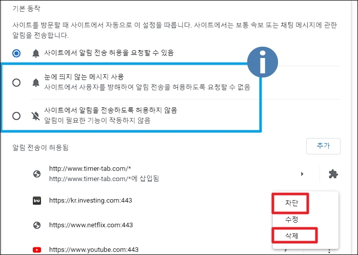 알림 페이지를 가지고 설명 드리겠습니다. "알림 전송이 허용됨" 문구 아래를 보면 여러 가지 사이트 주소가 표시되어 있는데요. 여기에서 우측에 있는 버튼을 누르면 "차단", "수정", "삭제" 진행을 할 수 있습니다. 인터넷 광고창 안뜨게 만들고 싶다면 차단이나 삭제를 선택해주면 돼요.