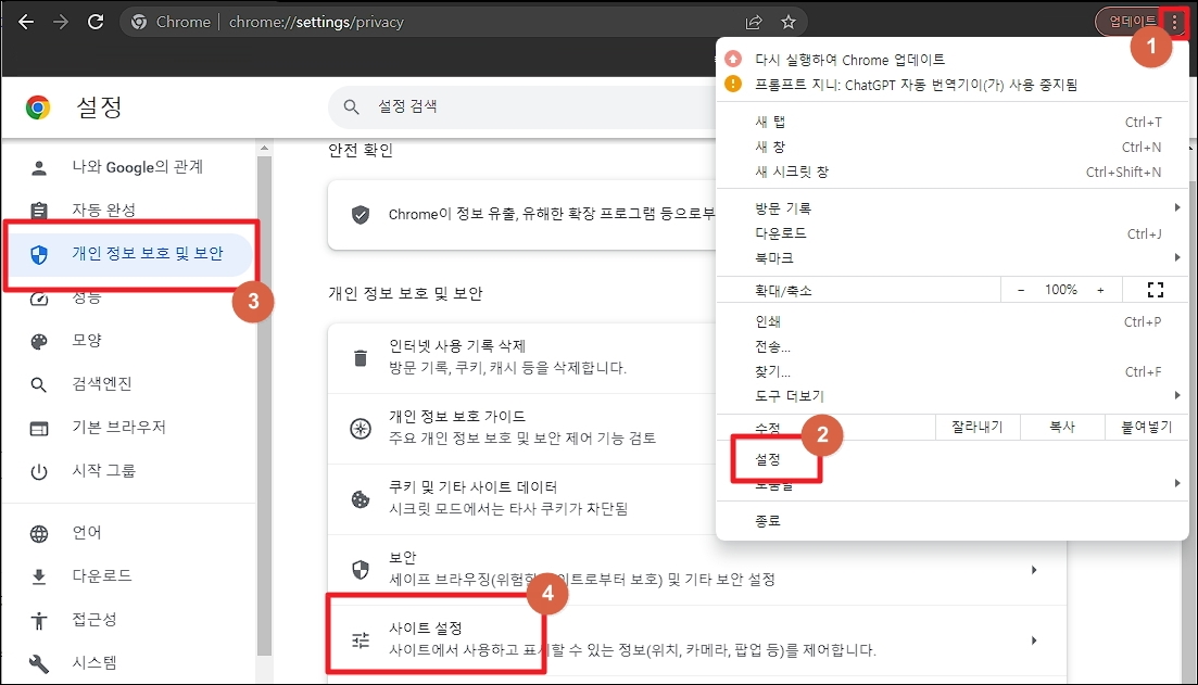 설정 페이지가 열리면 [개인 정보 보호 및 보안] 메뉴를 선택 후, 해당 메뉴 페이지에 있는 [사이트 설정]을 선택합니다.