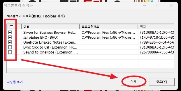 익스플로러 최적화 메뉴를 선택했습니다. 우리가 알게 모르게 인터넷 익스플로러에 광고창을 발생시키는 툴바나 애드온 등이 설치되어 있을 수 있는데요. 이러한 것을 모두 선택한 후 삭제를 진행해주세요. 삭제 하는법은 간단합니다. 프로그램 이름에 있는 체크 표시를 누른 후 우측 하단에 있는 [삭제] 버튼을 누르면 돼요.