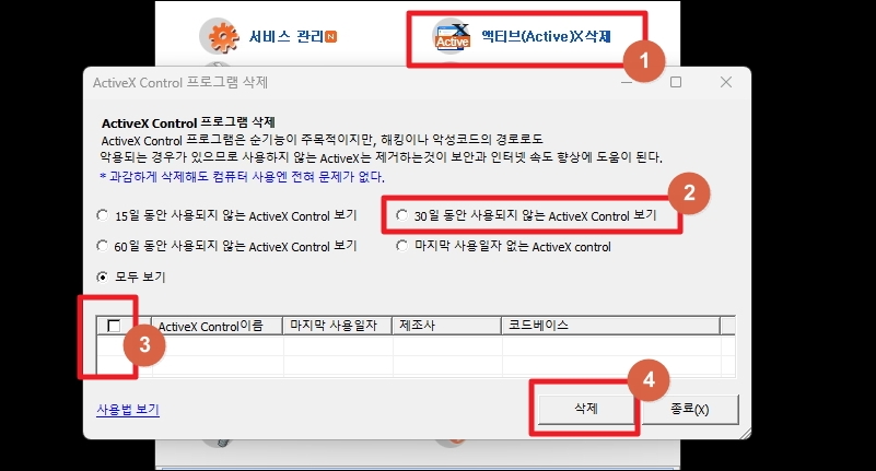 일부 액티브X 프로그램의 경우에는 인터넷 광고창을 발생시키는데요. 해당 프로그램을 제거함으로써 광고창을 안뜨게 만들 수 있습니다. 저는 전부 삭제하는 것을 선호하지만, 안전하게 진행하고 싶다면 "30일 동안 사용되지 않는 것" 위주로 삭제하시길 바랍니다.
