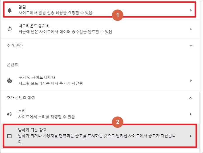 사이트 설정 페이지에서는 화면 상단에 있는 [알림] 메뉴와 추가 콘텐츠 설정에 있는 [방해가 되는 광고]를 선택하면 되는데요. 각 메뉴를 선택하여 나온 리스트에서 현재 자주 나타나는 인터넷 광고창에 관련된 사이트를 차단하거나 삭제해 주세요. 차단 및 삭제 하는법은 다음 단계와 같이 진행하면 됩니다.