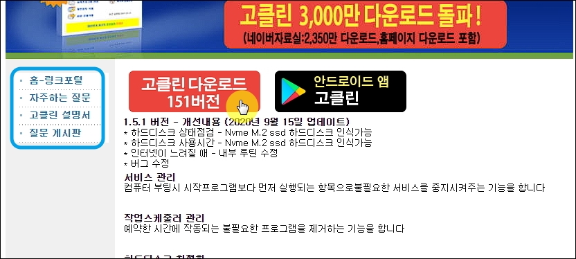 가장 최신 버전의 고클린 프로그램을 설치해 주세요. 최신 버전은 151버전인데요. 고베스트 사이트에는 설명서, 질문 게시판, 자주하는 질문과 같은 메뉴얼 및 문의 서비스도 제공하고 있으니 참고하시길 바랍니다.