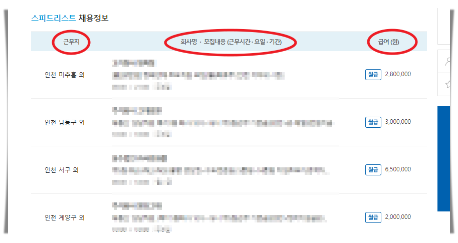 9. 저는 인천 지역을 선택했는데요. 위와 같이 많은 구인구직 정보를 확인할 수 있어요. 근무지, 회사명, 모집내용, 급여 내용이 깔끔한 표로 정리가 되어 있어서 이렇게 보는 것이 더 낫다고 하는 사람도 있습니다.