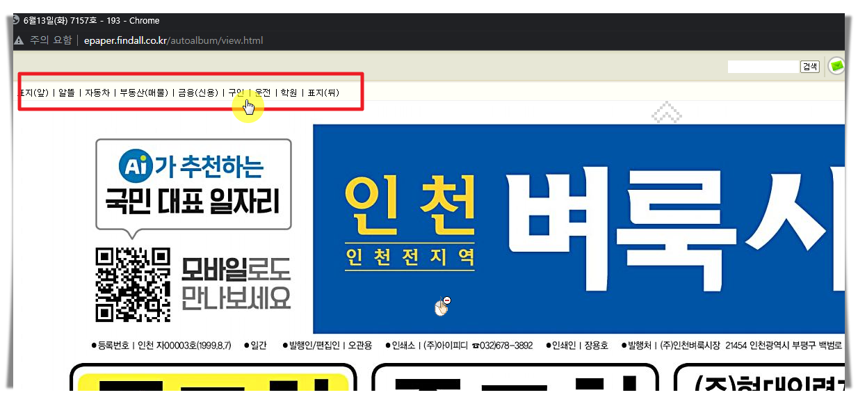 5. 날짜를 선택하면 위와 같이 E-PAPER 프로그램이 실행됩니다. 그럼 컴퓨터 모니터를 통해 벼룩시장 종이신문을 볼 수 있는데요. 가장 먼저 좌측 상단에 있는 카테고리 메뉴를 선택해주세요. 구인구직도 여기에 포함이 되어 있습니다.