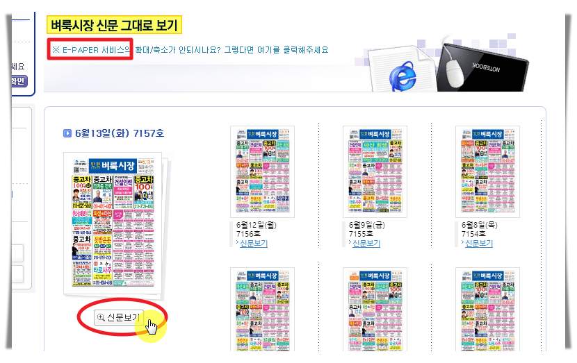 4. 벼룩시장 신문 그대로보기 서비스 페이지가 열렸습니다. 이곳에서는 "E-PAPER 서비스"라고 불리기도 하는데요. 금일자 종이신문은 물론이고, 과거에 발행이 되었던 종이신문을 보는 것이 가능합니다. 과거 정보를 알아볼 때에도 그대로보기 서비스가 유용해요.