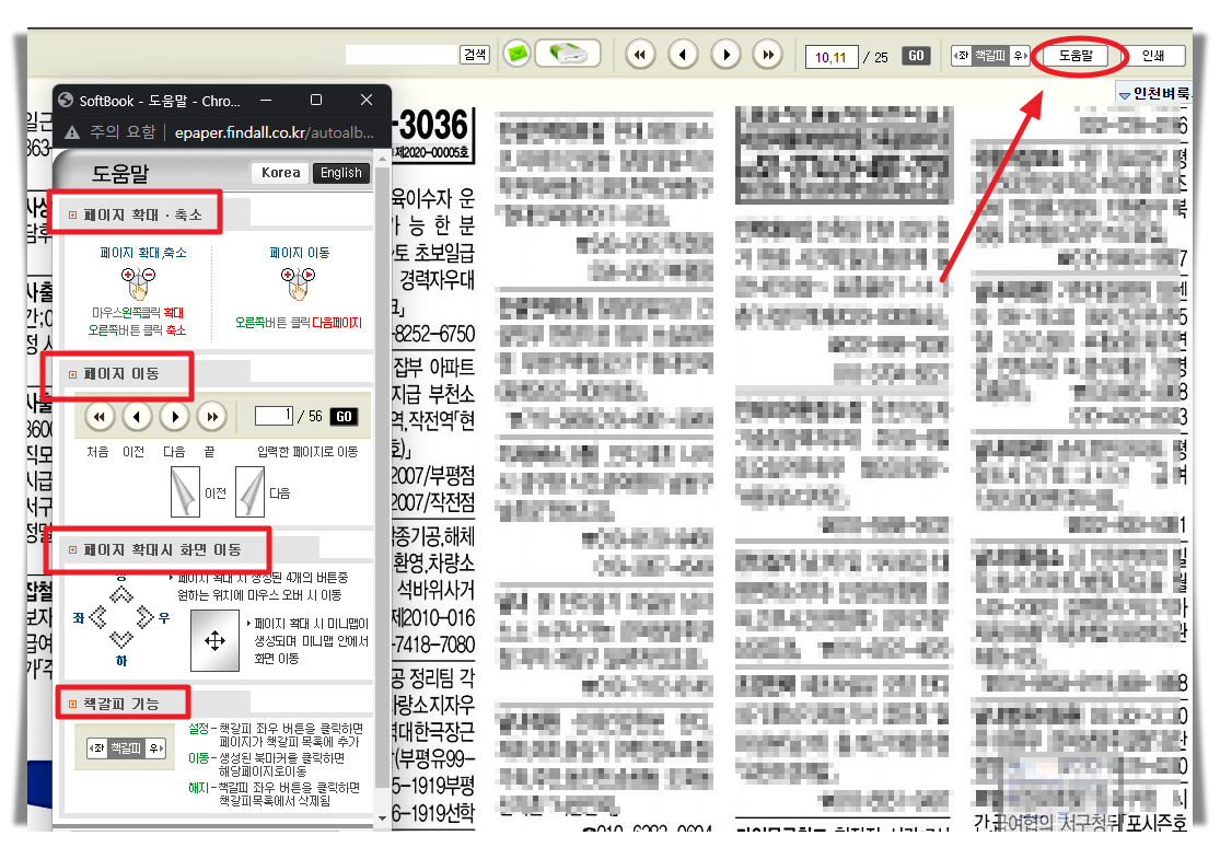 7. 그대로보기 서비스를 이용할 때 알고 있으면 좋은 유용한 팁을 몇 가지 알려드릴게요. 도움말 버튼을 누르면 확인이 가능한데요. 페이지를 다루는 기능과 책갈피 기능, 검색 기능을 사용할 수 있습니다.