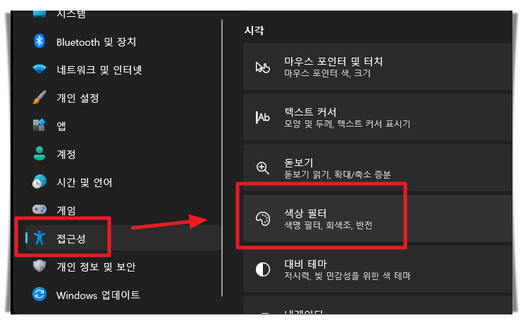 4. 윈도우10에서 제공하는 또 다른 기능을 통해 모니터 화면의 밝기에 영향을 줄 수 있는데요. 설정 창에서 "접근성" 메뉴를 선택해 주세요. 그럼 우측에 시각 카테고리가 나타납니다. 여기에서 "색상 필터"를 선택해 주세요.