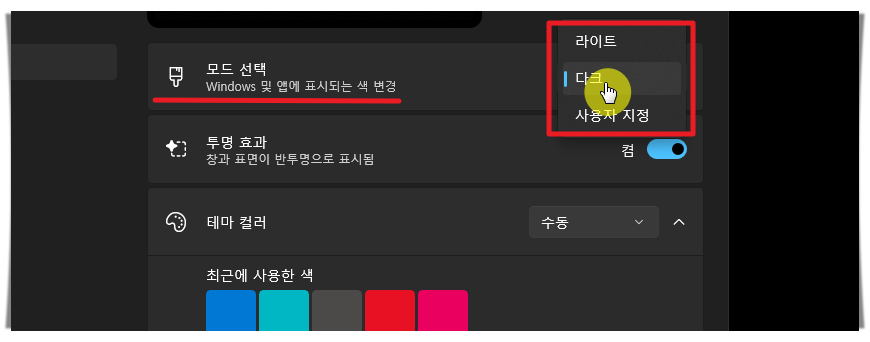 6. 새롭게 열린 창에서 보면 모드 선택을 할 수 있도록 되어 있습니다. 여기에서 "라이트"가 아닌 "다크"로 지정해 주세요. 그럼 윈도우10을 사용하면서 볼 수 있는 여러 색들이 어두운 계열의 색으로 바뀝니다.