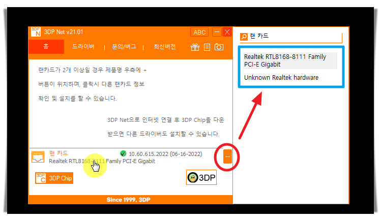 7. 3dp net을 실행한 화면입니다. 하단 부분에 보면 랜 카드 이름이 나타나는데요. 혹시 2개 이상의 어댑터가 잡히는 경우에는 오른편에 플러스 모양의 아이콘이 나타납니다. 해당 아이콘을 선택한 후 주로 사용하는 랜 카드를 선택해 주세요. 그 다음 프로그램 화면에 있는 랜 카드 이름을 클릭합니다.
