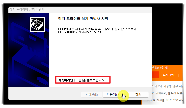8. 랜 카드 제품명을 클릭하면 위와 같은 장치 드라이버 설치 마법사가 실행이 됩니다. 안내에 따라 "다음" 버튼을 누르면 네트워크 어댑터의 드라이버를 설치하게 됩니다. 다 설치가 되면 바로 인터넷을 사용할 수 있을 거에요.