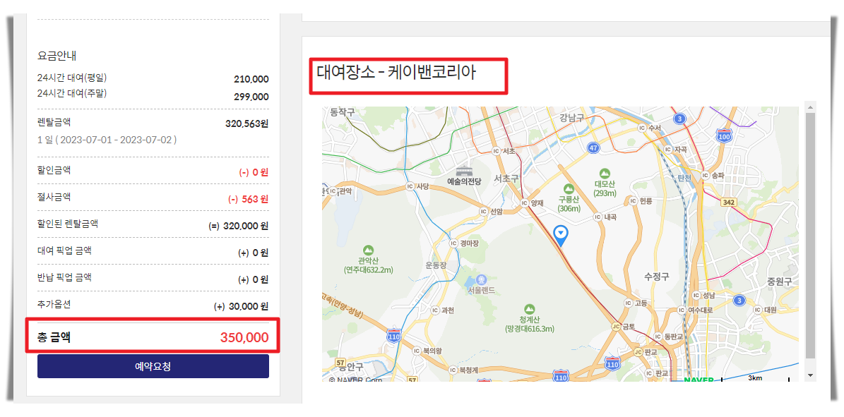 6. 좌측 하단에 보면 여러 가지 비용을 계산하여 나온 결과가 나타납니다. 하루 이용하는 데에 35만원의 비용이 발생함을 알 수 있어요. 대여장소를 지도로 나타내고 있으니 픽업을 할 때 참고해 주세요.