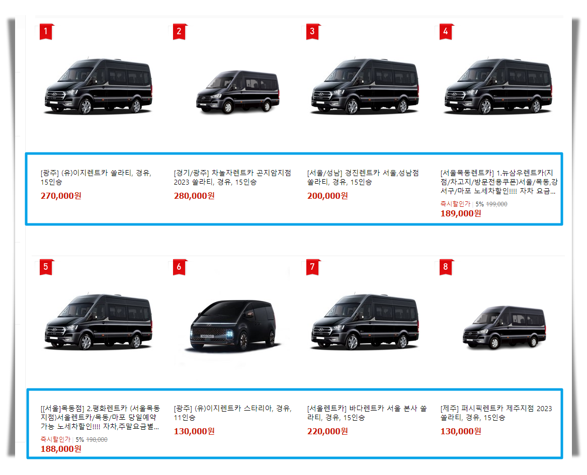 8. "15인승 승합차"로 검색을 하면 여러 가지 서비스 상품이 나타나는데요. 지역에 따라 금액 차이가 많이 나네요. 저렴한 것은 13만원에도 이용이 가능하네요.