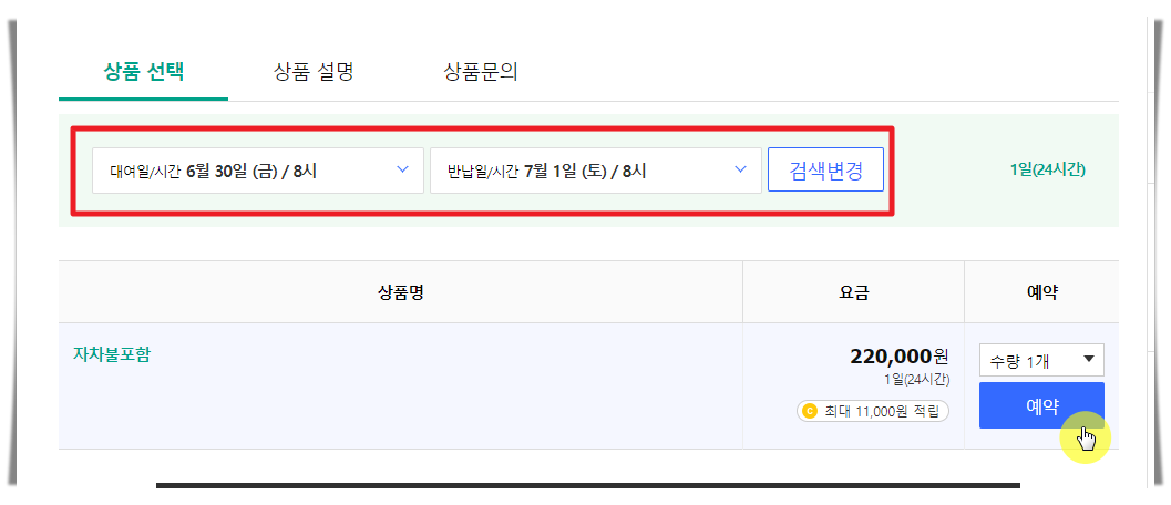 9. 상품을 선택한 후 대여일과 반납일, 그리고 시간을 정확하게 입력한 후 "예약" 버튼을 누르면 됩니다. 참고로 안내 사항, 대여조건, 유의사항이 상세하게 적혀 있으니 이 부분을 꼼꼼히 읽어보고, 예약 진행을 하시길 바랍니다.