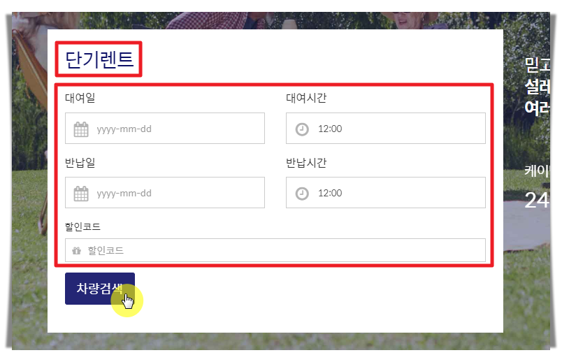 3. 이곳은 주로 15인승 승합차에 대한 대여 서비스를 다루는데요. 사이트에 접속하면 메뉴에스 "단기 렌트"를 선택해 주세요. 그 다음 대여일, 대여시간, 반납일, 반납시간 등의 정보를 입력한 후 "차량 검색" 버튼을 누릅니다.