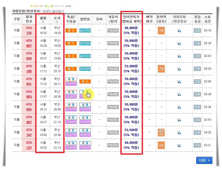 7. 서울에서 부산으로 운행하는 케이티엑스(KTX)에 대한 시간표가 나타났습니다. 인터넷 특가 금액도 확인이 가능한데요. 여기서 예매 버튼을 누르면 바로 예약 진행도 할 수 있습니다.