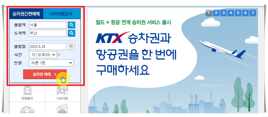 5. 이번에는 이용할 케이티엑스(KTX) 노선에 대한 시간표만을 알아보는 방법을 알려드리겠습니다. 레츠코레일 사이트의 메인화면에서 "승차권 간편예매" 영역을 찾아주세요. 여기에 출발역, 도착역, 출발일, 시간, 인원 정보를 입력한 후 "승차권 예매" 버튼을 클릭합니다.