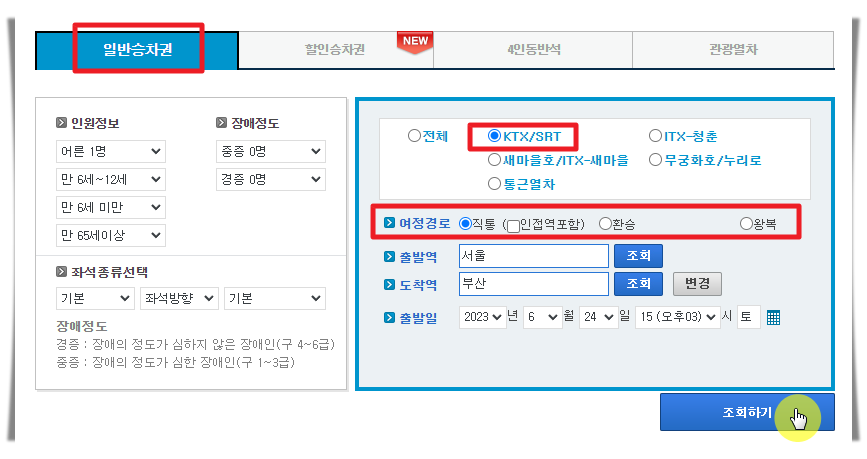 6. 새롭게 열린 페이지에서 "일반 승차권"을 선택한 후 오른편에 있는 열차 종류에서 "KTX/SRT"를 선택합니다. 직통, 환승, 왕복 여부를 체크한 후 "조회하기" 버튼을 눌러주세요.
