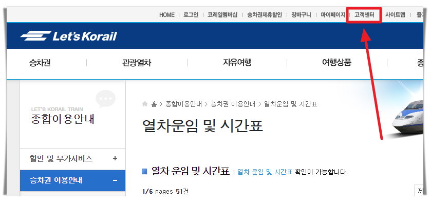 2. 우선 전체적으로 모든 노선에 대한 케이티엑스 시간표를 알아보도록 하겠습니다. 사이트에 접속하면 우측 상단에 고객센터 메뉴가 있습니다. 해당 메뉴를 선택한 이후에 좌측에 있는 "승차권 이용안내" 카테고리를 열어주세요.