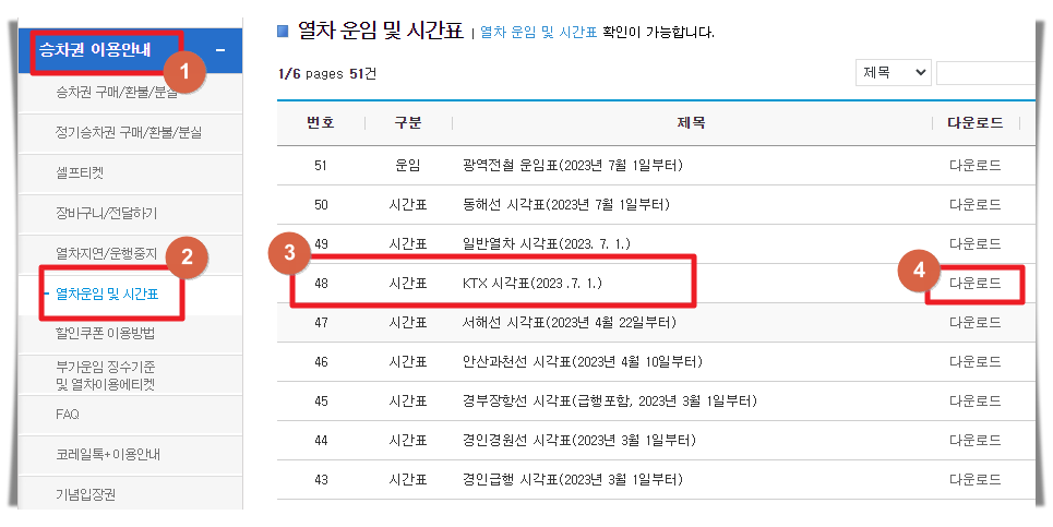 3. 승차권 이용안내 카테고리에는 여러 메뉴가 속해 있는데요. 여기에서 "열차운임 및 시간표" 메뉴를 선택합니다. 그럼 우측에 케이티엑스(KTX) 시간표 게시물을 찾을 수 있습니다. 이외에도 동해선, 광역전철, 서해선, 안산과천선, 경인급행 등 여러 열차에 대한 운행 정보를 제공하고 있습니다. 그럼 다운로드 버튼을 눌러 전체 시간표를 내려 받아주세요.