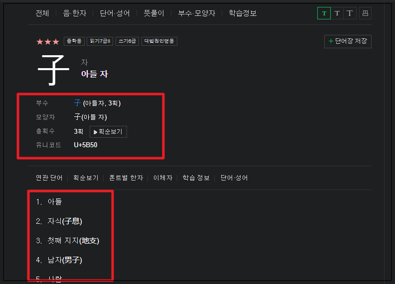 6. "아들 자"라는 한문에 대한 상세한 사전 정보가 나타나는데요. 부수, 모양자, 총획수, 유니코드, 난이도 등의 정보와 함께 해당 한자에 속하는 다양한 뜻과 의미를 파악할 수 있습니다.