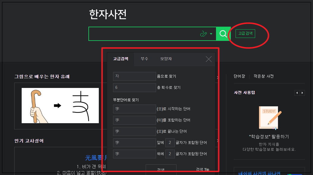 2. 한자 사전 사이트에 접속하면 검색창 오른 편에 있는 고급 검색 버튼을 눌러보세요. 기존의 옥편으로 한번 찾기를 하던 시절에 많이 사용하던 방식을 이용해 볼 수 있습니다. 음, 총 획수, 부수, 모양자를 이용하여 한문찾기를 할 수도 있고요. 추가적으로 부분 단어로 한자로 쓰여진 단어를 검색하는 것도 가능합니다. 기존의 옥편 사용법에 익숙하거나 한문에 대해 잘 아는 분들이 사용하기에 좋은 검색 방식입니다.