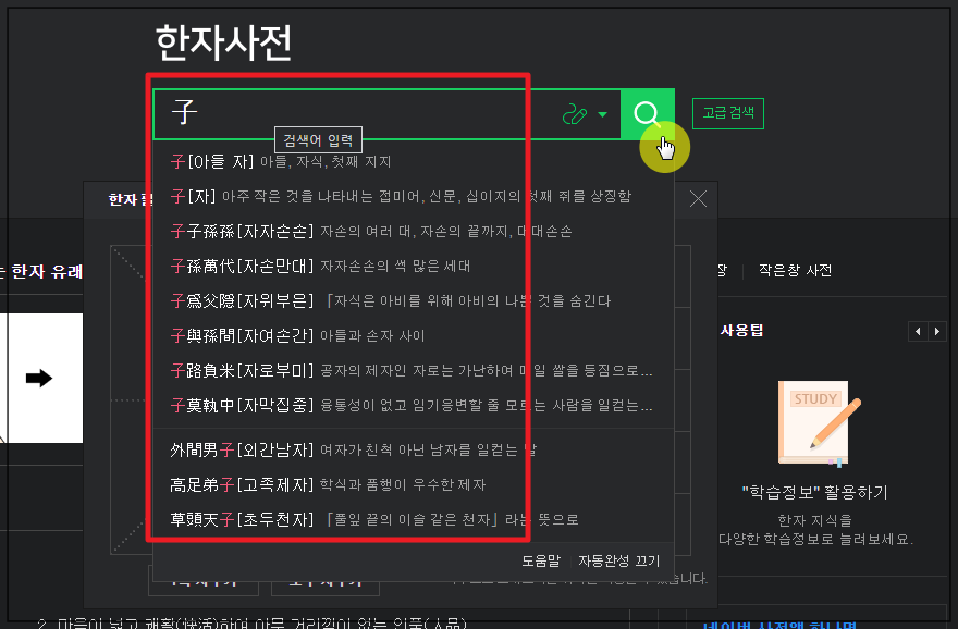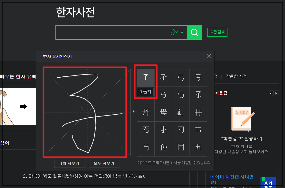 4. 저는 한문에서 많이 사용되는 "아들 자"라는 한자를 그려 보았습니다. 이에 따라 네이버 사전에서 비슷한 모양의 한문이 여러 개 나타나는데요. 이 중에서 알아 보고 싶은 한자를 마우스로 클릭해 주세요.