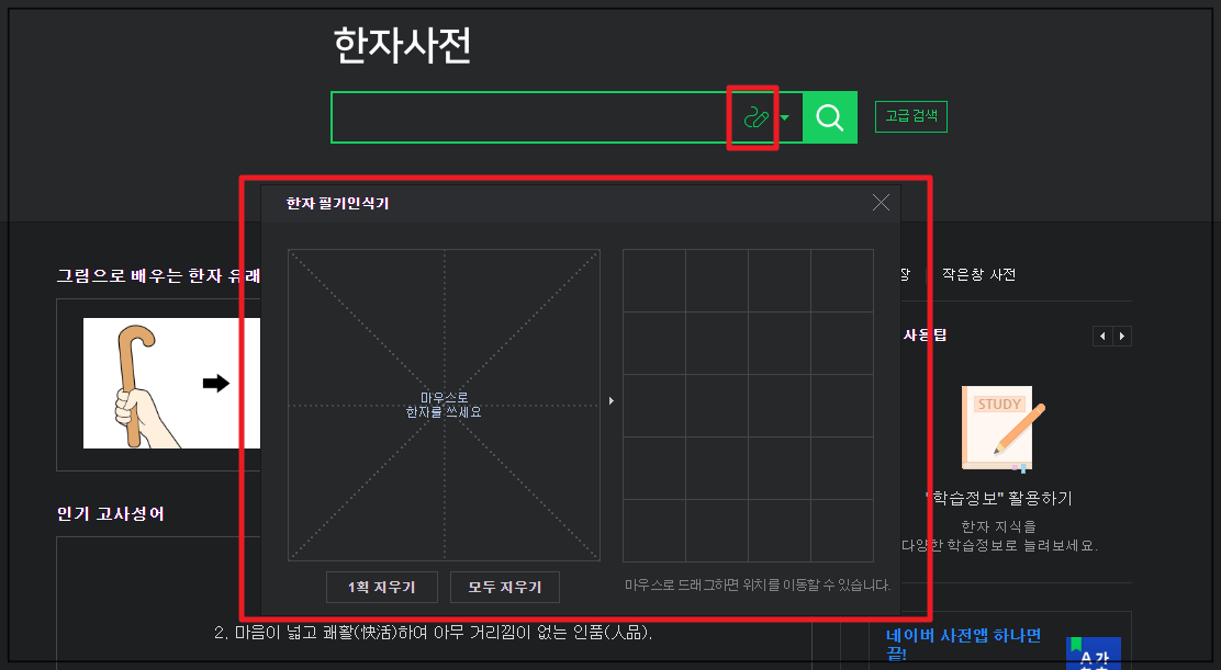 3. 이번에는 새로운 방식으로 한문찾기를 해 보도록 하겠습니다. 검색창 오른 편에 있는 필기 버튼을 클릭해 보세요. 그럼 검색창 주변의 한자 필기 인식기가 나타납니다. 마우스로 한자를 쓰라고 표시가 되어 있는데요. 해당영역에 제가 한번 한자를 그려보겠습니다.
