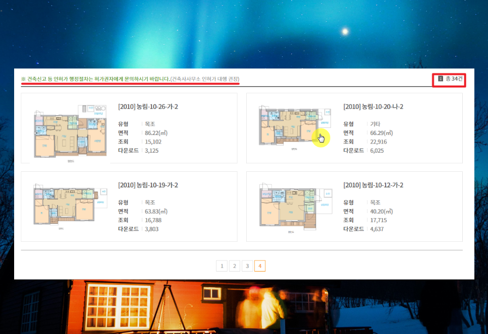 5. 총 34건의 도면 자료를 만나 볼 수 있는데요. 평면도 그림을 통해 어떤 구조인지 대충 확인할 수 있습니다. 이렇게 평면도와 유형, 면적을 참고하여 자료를 선택해 주세요. 사람들이 많이 찾는 전원주택을 짓고 싶은 경우에는 조회나 다운로드 횟수가 높은 자료를 선택하면 됩니다.