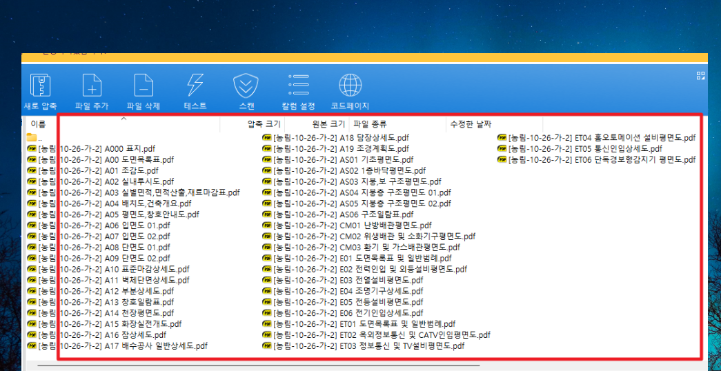7. 압축된 파일에 어떤 설계 도면 있는지 살펴 보겠습니다. 전원주택을 지을 때 필요한 설계도는 거의 모두 들어 있다고 보시면 됩니다. 도면목록표, 조감도, 실내투시도, 배치도, 평면도, 입면도, 단면도, 표준마감상세도, 부분상세도, 창호일람표, 천장평면도, 화장실전개도, 잡상세도, 배수공사 일반상세도 등 주택 건축에 필요한 도면 자료를 만나볼 수 있어요.