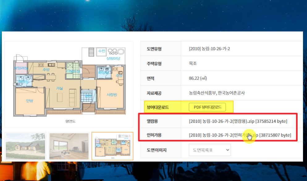 6. 제가 선택한 자료에 관련된 페이지가 열렸습니다. 면적이 86.22 제곱미터인 것으로 보아 대략 26평 정도 되는데요. 설계 도면 설명 부분에서 열람용과 인허가용 항목을 살펴보아 주세요. 여기에 있는 파일 이름을 클릭하면 자료를 다운로드 받을 수 있습니다. 확장자가 zip으로 되어 있기 때문에 알집이나 반디집 같은 압축 해제 프로그램을 사용하여야 파일에 접근할 수 있습니다.