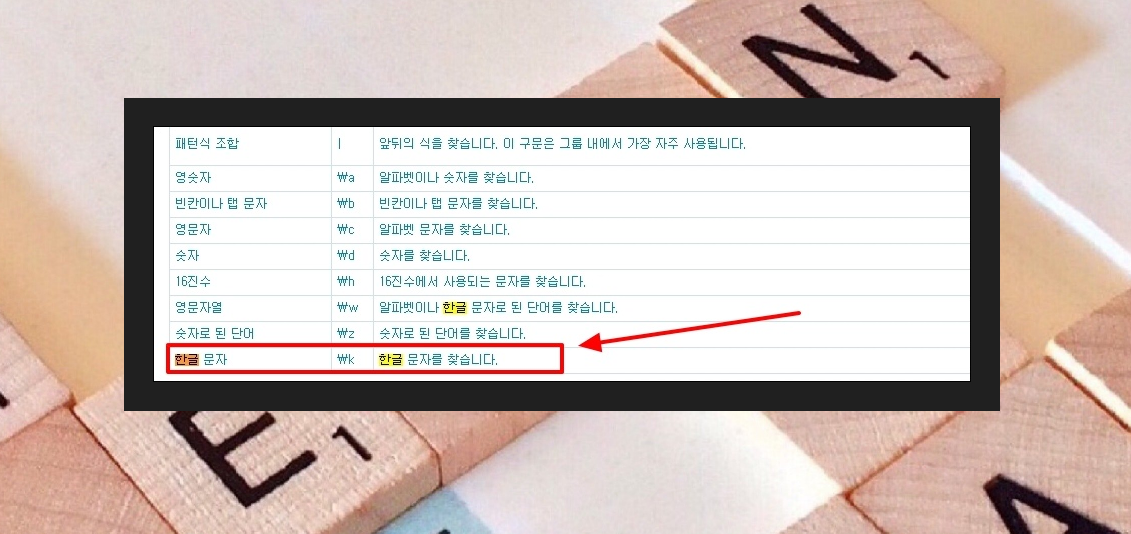 한글 문자의 경우 "₩k"를 사용하면 한국어로 된 모든 문자를 찾을 수 있습니다.