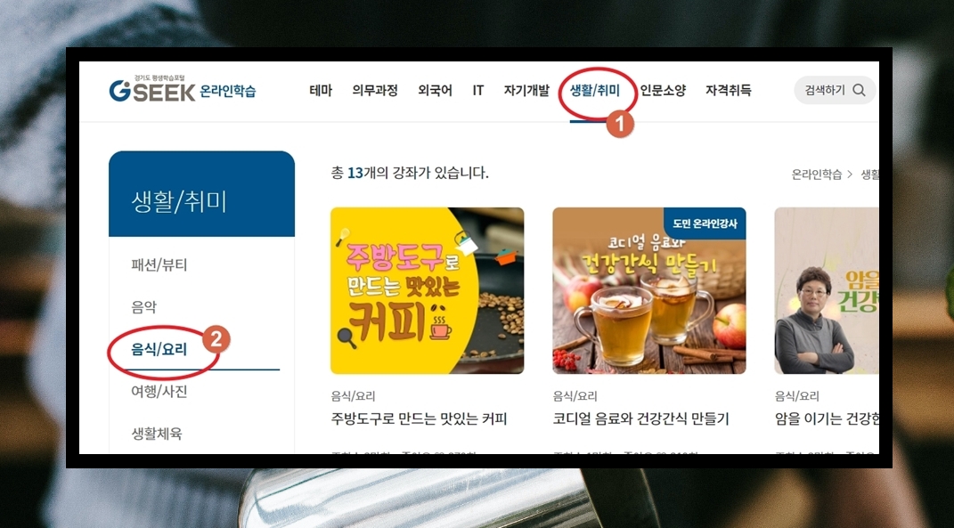 4. 메뉴에서 "생활/취미"를 선택한 후 좌측에 있는 소메뉴에서 "음식/요리"를 선택합니다.