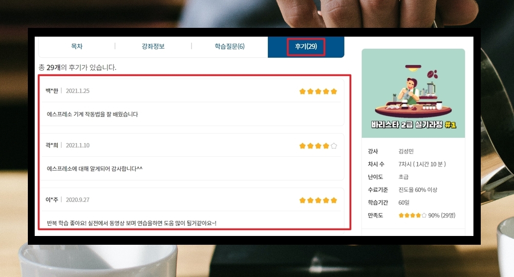 바리스타 2급 실기 과정의 경우 29개의 후기가 등록되어 있는데요.
