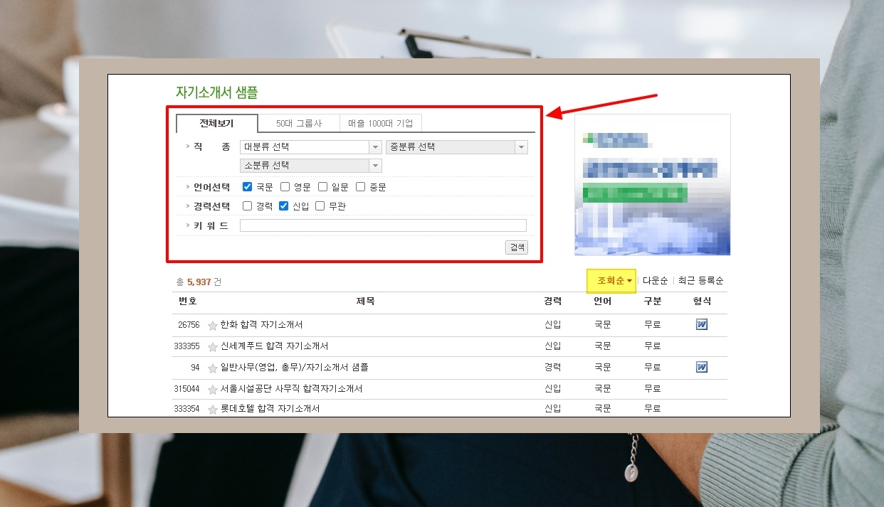 4. 몇 가지 조건 지정을 통해 내게 맞는 자기소개서 샘플을 구할 수 있습니다. 신입 또는 경력, 50대 그룹사, 매출 1000대 기업 등의 조건을 지정하거나 키워드 검색을 통해 관심 있는 회사의 이름을 검색해 볼 수도 있습니다. 이곳에서 볼 수 있는 자기소개서는 5937건이나 됩니다. 조회순이나 다운로드 순으로 정렬을 하면 사람들이 많이 본 자료를 찾을 수 있습니다.