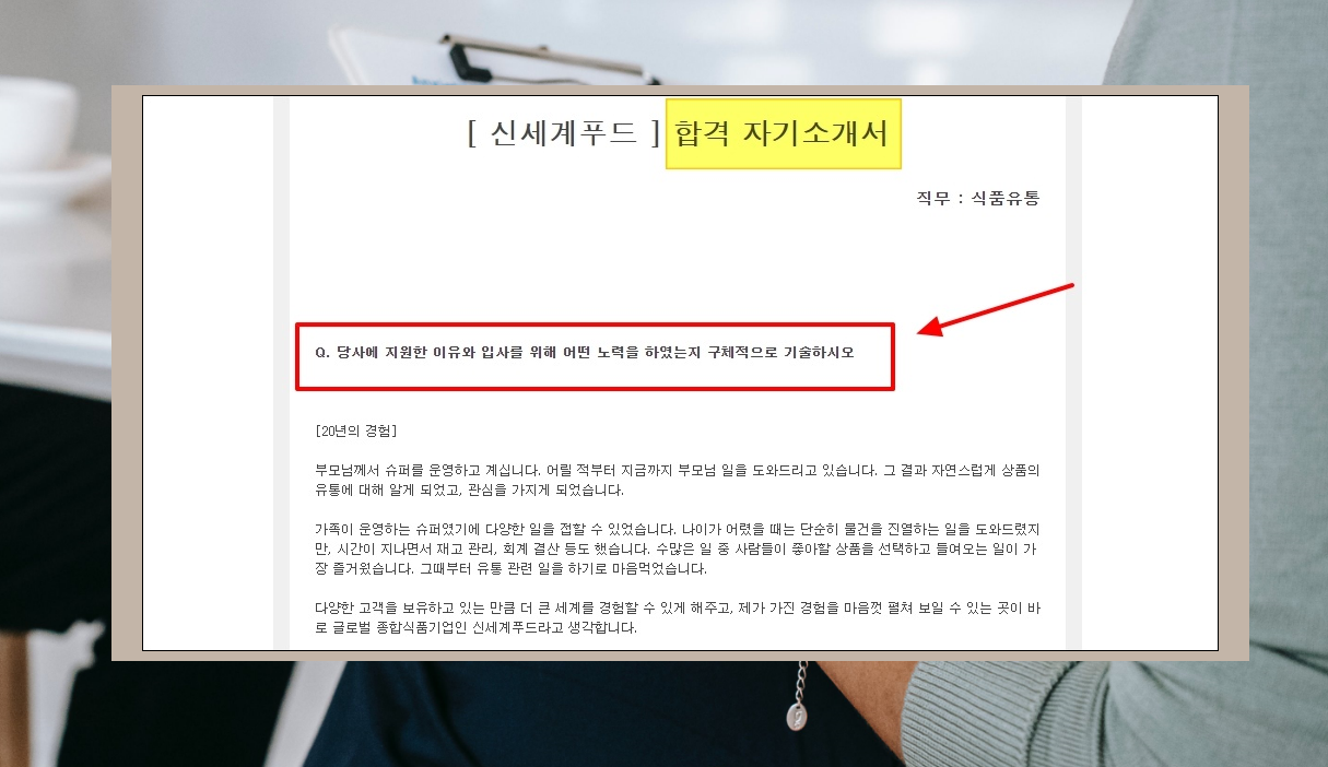 5. 신세계푸드에 합격한 사람이 작성한 자기소개서를 살펴보았습니다. 일반적으로 많이 쓰는 소제목이 있는데요. "20년의 경험"이라고 되어 있어서 무엇을 했는지 호기심을 유발합니다.