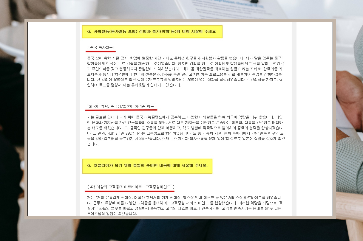 6. 또 다른 자료를 살펴보겠습니다. 이곳에서도 소제목 쓰는 방법을 사용했는데요. 인사담당자가 자기소개서를 쉽게 읽을 수 있도록 단문과 쉼표 사용을 적절하게 사용하는 모습이 보입니다.