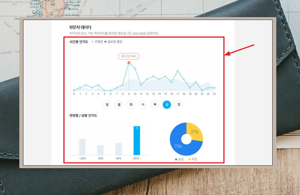 5. 사람이 많이 방문하는 곳이라면 방문자 데이터를 확인해 보세요. 언제 방문하는 사람이 적은지 쉽게 알 수 있어요. 연령별, 성별 인기도도 확인이 가능하네요.