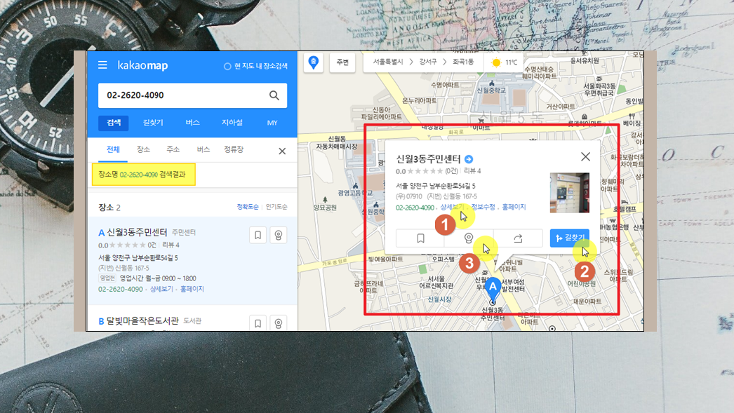 지금부터 제가 알려드리는 과정을 순서대로 잘 따라해 보세요. 한 두 번 연습하면 어렵지 않게 익힐 수 있으실 겁니다. 그리고 이것은 여러분이 새로운 장소를 탐색하거나 주어진 전화번호로만을 가지고 위치찾기를 진행해야 할 상황에 큰 도움이 될 것입니다.