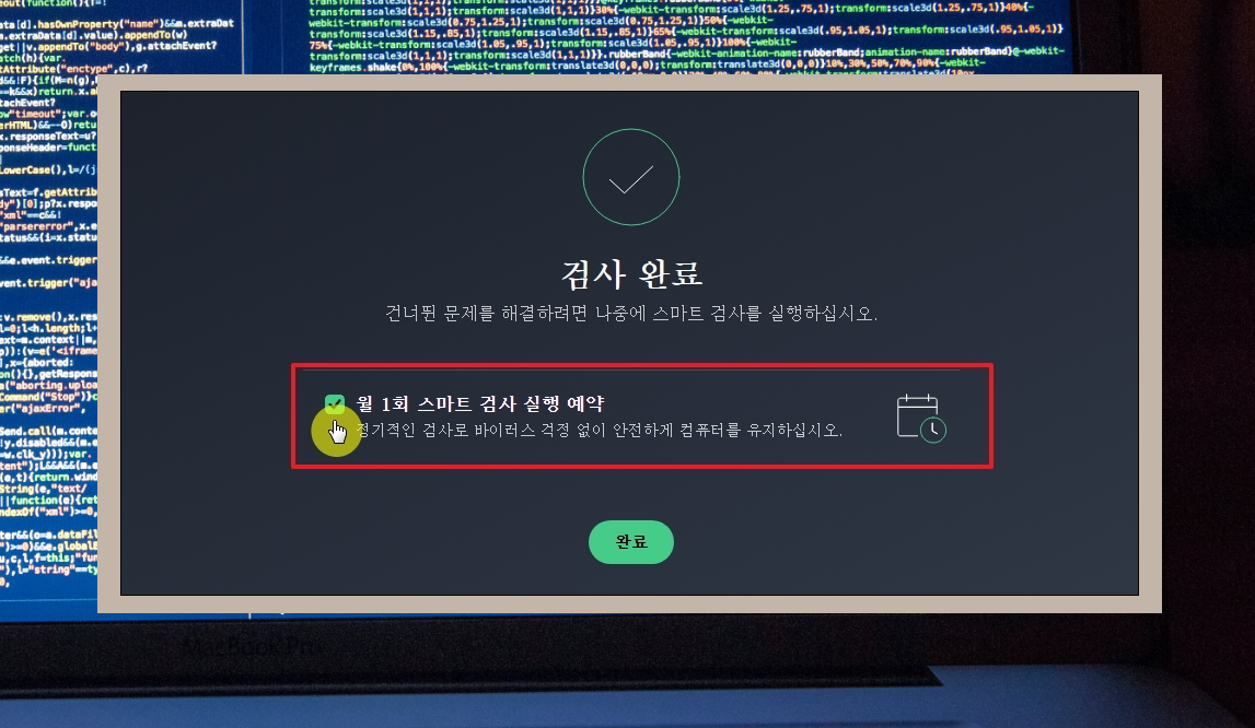 10. 검사 완료 이후에는 월 1회 스마트 검사 실행 예약도 가능합니다. 이렇게 예약을 해놓으면 직접 스마트 검사 툴을 실행할 필요가 없습니다. 자동으로 진행이 되기 때문입니다.