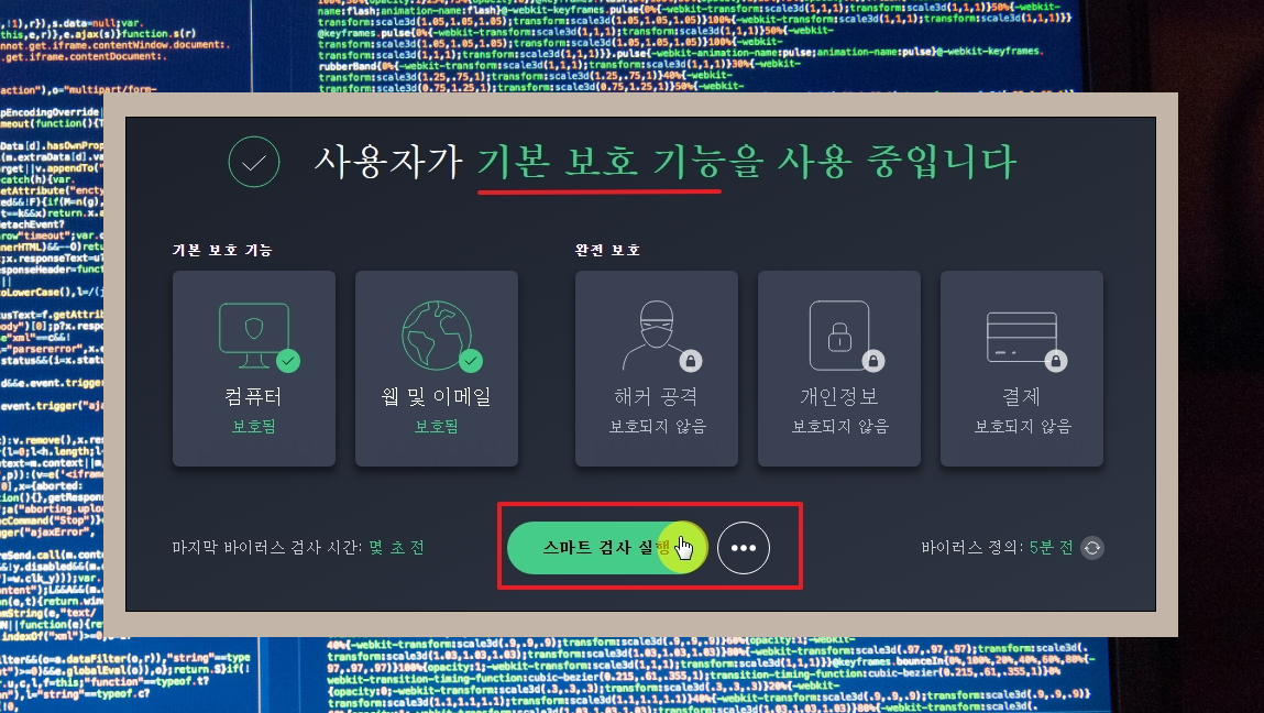6. 프로그램 설치가 완료되었습니다. 본격적으로 AVG를 이용한 컴퓨터 바이러스 없애는법을 알려드리겠습니다. 프로그램 화면 중앙 하단에 있는 [스마트 검사 실행] 버튼을 클릭합니다.