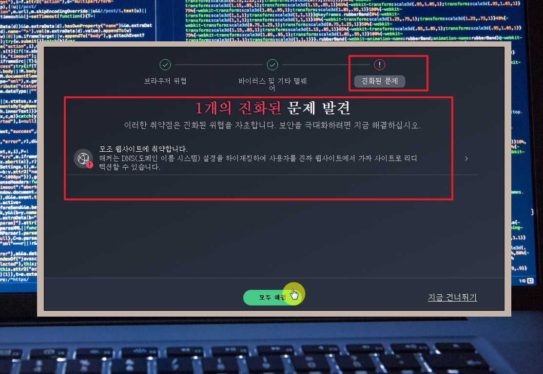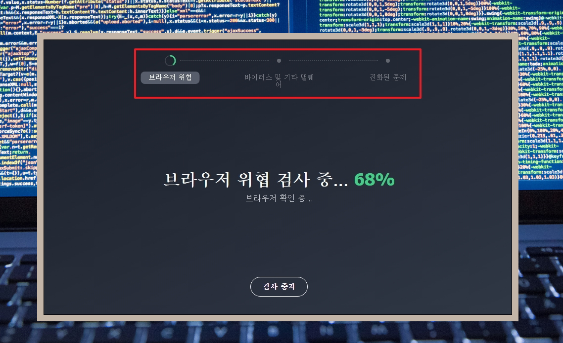 7. 스마트 검사는 총 3가지 단계를 거칩니다. 브라우저 위협, 바이러스 및 기타 펌웨어, 진화된 문제 이렇게 3가지 대상에 대한 검사를 하고, 문제가 있다면 자동으로 바이러스를 없애는 작업을 진행해 줍니다.