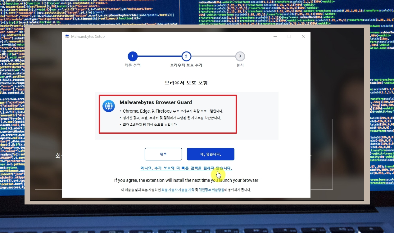 3. 설치 프로그램을 실행하면 다음과 같은 과정을 진행하게 됩니다. 안내에 따라 [다음] 버튼만 누르면 설치를 쉽게 완료할 수 있습니다. 컴퓨터로 인터넷을 많이 하신다면 크롬, 엣지, 파이어폭스 등에 사용할 수 있는 멀웨어바이트 브라우저 가드 프로그램을 추천 받을 수 있습니다. 이를 통해 사전에 예방을 하는 것도 가능합니다.