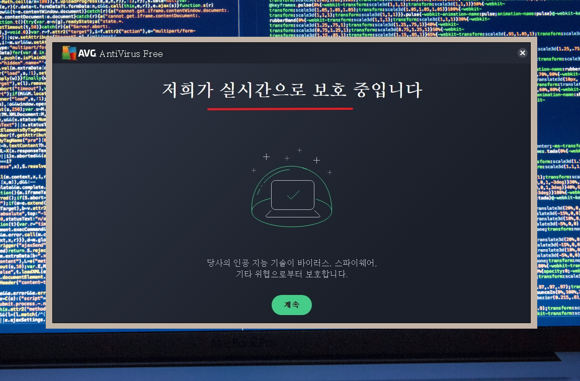 4. 해당 프로그램이 설치가 되면 다음과 같은 안내 문구가 나타납니다. 가장 먼저 자동으로 컴퓨터를 보호하기 위한 실시간 보호 기능이 켜집니다. 바이러스는 물론이고, 스파이웨어, 기타 위협으로부터 보호를 받을 수 있다고 합니다. 인공 지능 기술을 사용하기 때문에 좀 더 확실한 성능을 이용할 수 있습니다.