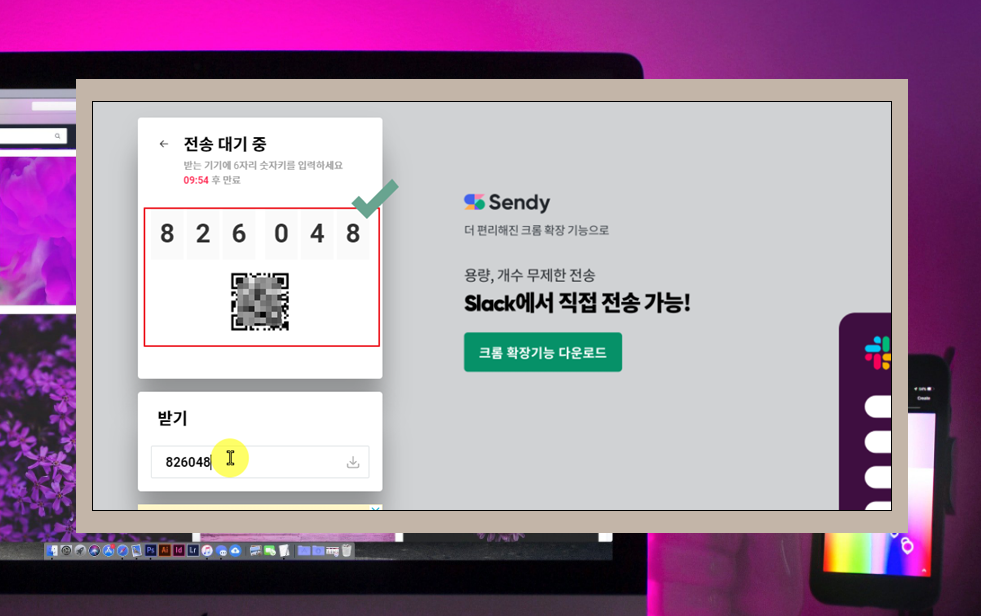6. 보내기 버튼을 클릭하면 6자리 숫자키와 QR코드가 나타납니다. 해당 숫자키를 이용하여 컴퓨터나 스마트 기기에서 받기 작업을 진행할 수 있습니다. 샌드애니웨어 사이트에 접속한 후 "받기" 영역에서 6자리 숫자키를 입력한 후 엔터키를 누르면 됩니다.