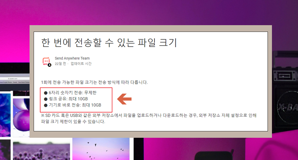 링크 공유와 기기로 바로 보내는 방법을 사용하는 경우 최대 10기가까지 전송이 가능합니다. 1회 전송 가능한 크기가 작다고 생각된다면 여러 번 나누어서 전송하면 무제한으로 보낼 수 있습니다. 한 번에 10기가 이상의 대용량 데이터를 보내고 싶다면 6자리 숫자키를 이용한 방법을 사용하면 됩니다.